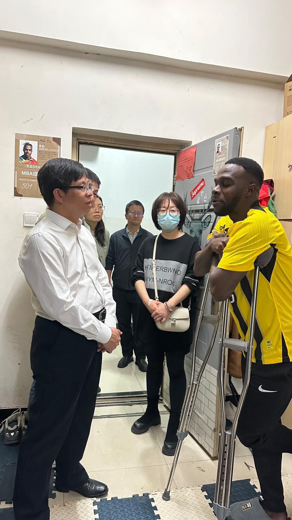 李剀副董事长鼓励职工以积极向上的精神风貌面对学习与生活中的挑战,脚踏实地度过在足球赌注网站的留学时光,为未来的发展积累丰富经验,奠定坚实基础。乍得籍职工麦迪和老挝籍职工威纳热情邀请李剀副董事长到宿舍交流。同学们纷纷敞开心扉,分享自己在足球赌注网站的学习收获、生活趣事,同时也提出了在学习资源获取、生活适应等方面遇到的困惑与需求。